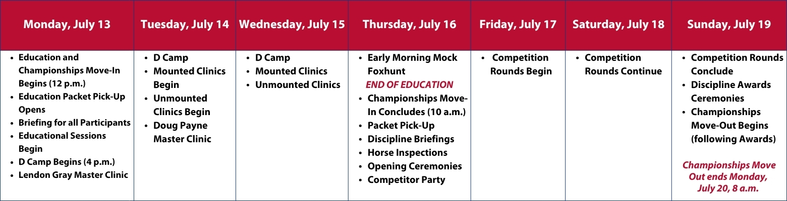 Festival Education clinics will occur prior to Championships competitions in 2026. Members and non-members who register for mounted educational sessions have the opportunity to ride in mounted clinics twice a day and may choose to attend as many unmounted clinics as they wish. Mounted clinics include Eventing Cross-Country, Polocrosse, Western Dressage, Mounted Games, Hunter Seat Equitation, Show Jumping, Dressage, Trail, and Groundwork and Natural Horsemanship. Additionally, members can participate in a mock foxhunt at the Kentucky Horse Park but must sign up when they register. Members and non-members can also register for Unmounted Education, with workshops that will focus on hands-on learning, demonstrations for all levels of equestrians, advances in equine health care, and more.